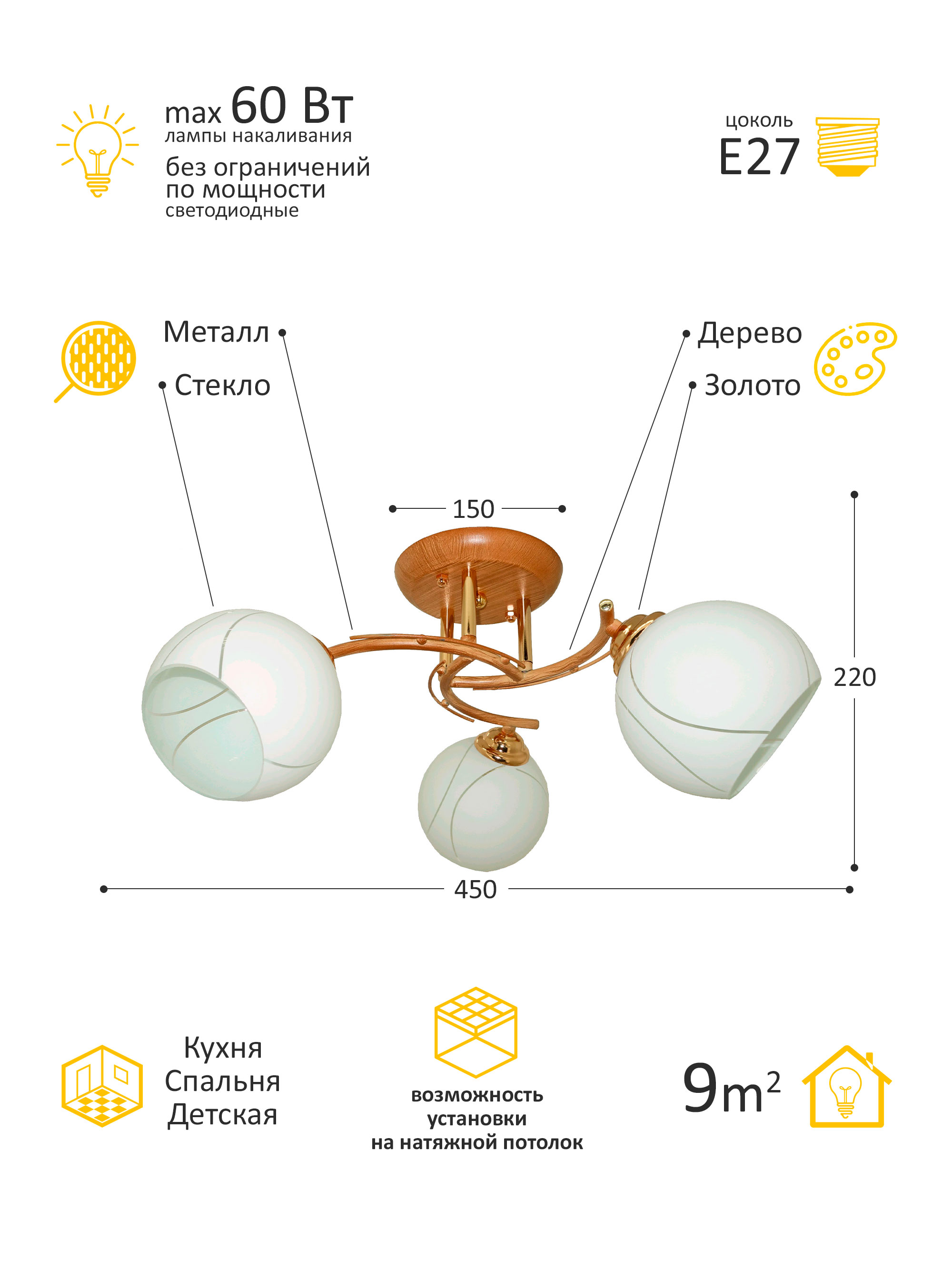 Примерная площадь освещаемая люстрой9 кв.м.