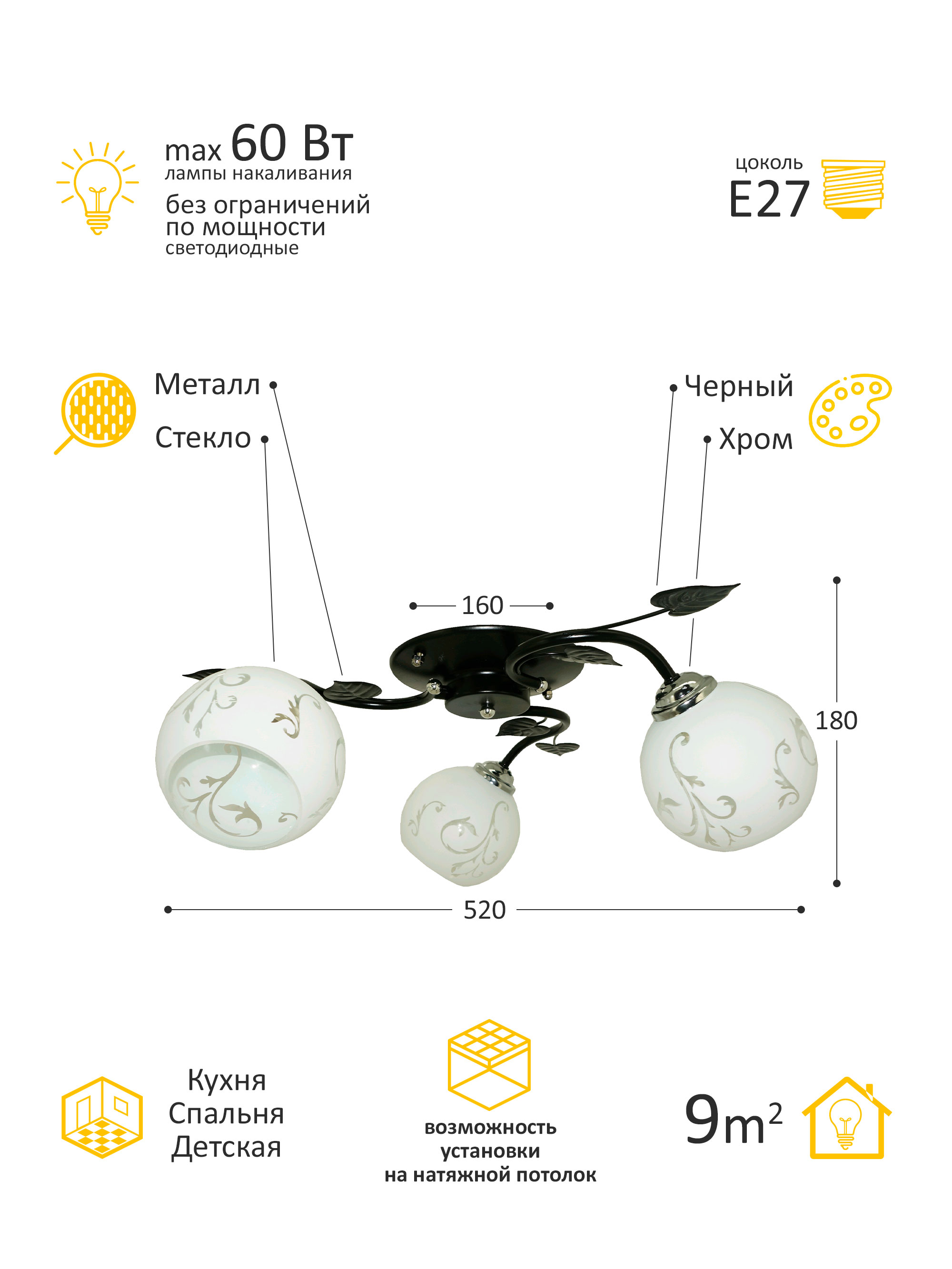 Примерная площадь освещаемая люстрой9 кв.м.